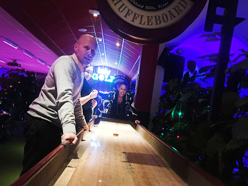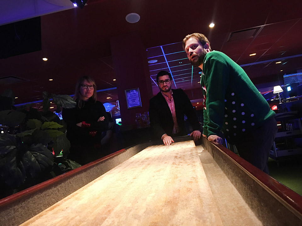 Efter att ha satt i oss någon nubbe, lite pilsner samt all julmat i världen var det äntligen dags att utmana varandra på trekamp. Vi blev tilldelade en lekledare och sedan började Klinggruppens interna Shuffleboardbonanza. Trots en mycket jämn och spännande match avgick ändå Johannes som den obestridda segraren i denna ädla gren.